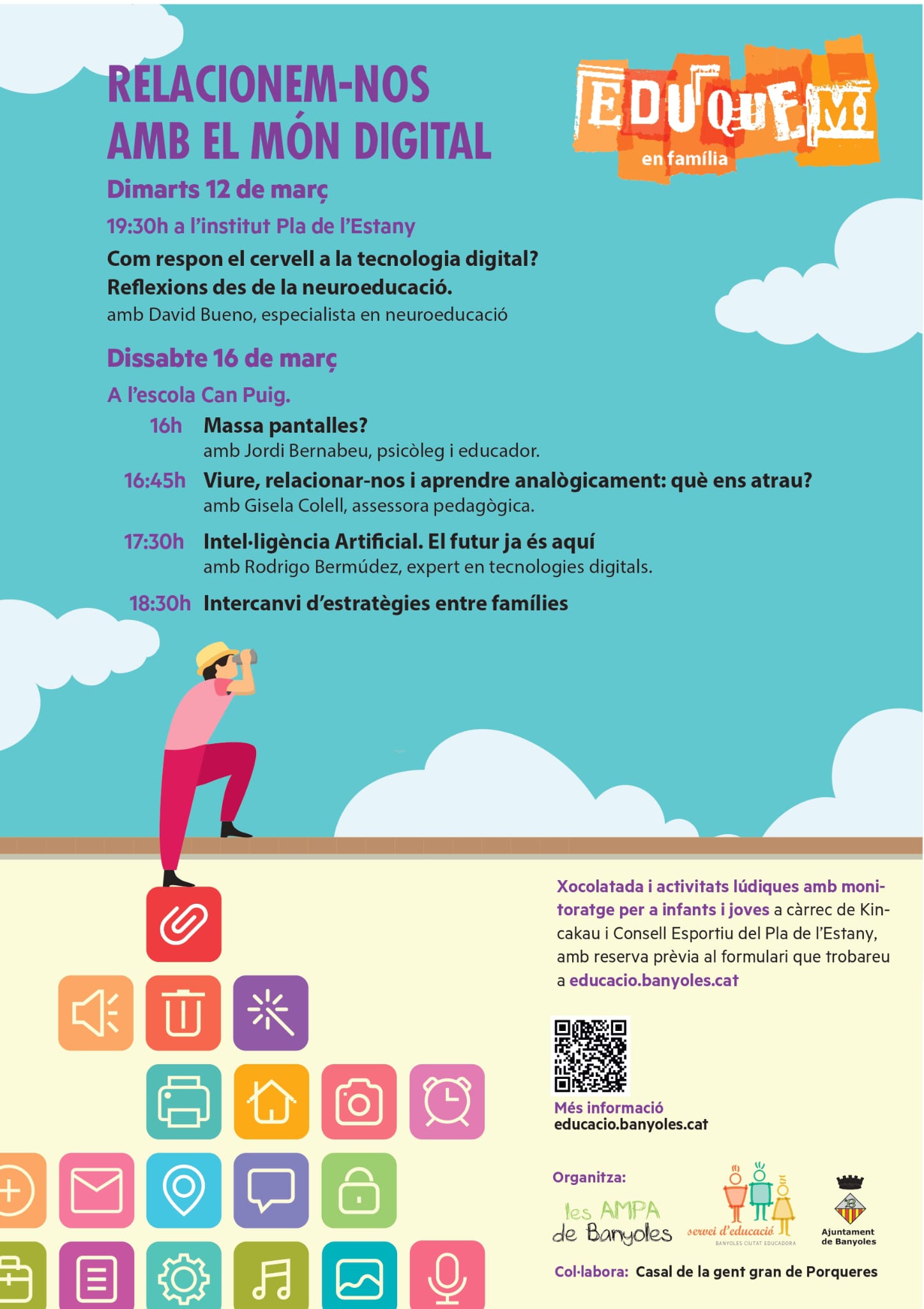 Arran d’aquesta xerrada, us oferim altres propostes que formen part d’un cicle de xerrades i activitats formatives que tracten el tema de com relacionar-nos amb el món digital. Eduquem en família, és un programa que al llarg del curs escolar, es porta a terme a diferents espais de Banyoles i és organitzat per les Associacions de Famílies d’Alumnes dels centres educatius de la ciutat, conjuntament amb el Servei d’Educació de l’Ajuntament de Banyoles.