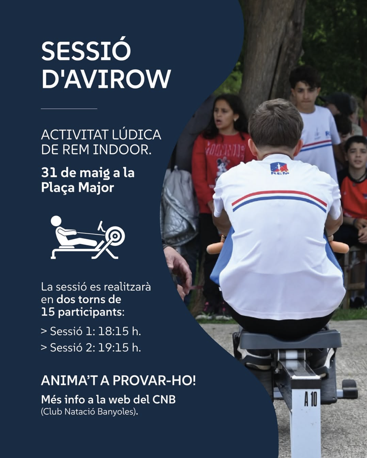 El proper dissabte 31 de maig, es portarà a terme una sessió d’AVIROW a la Plaça Major. Una activitat lúdica de rem indoor organitzada pel CNB i l’Associació de Comerç i Turisme de Banyoles dins el marc de la 47ª edició de l’Exposició de Flors.