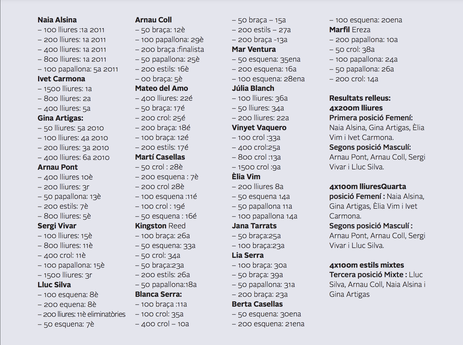 - 4x100m estils mixtesTercera posició Mixte : Lluc Silva, Arnau Coll, Naia Alsina i Gina Artigas.