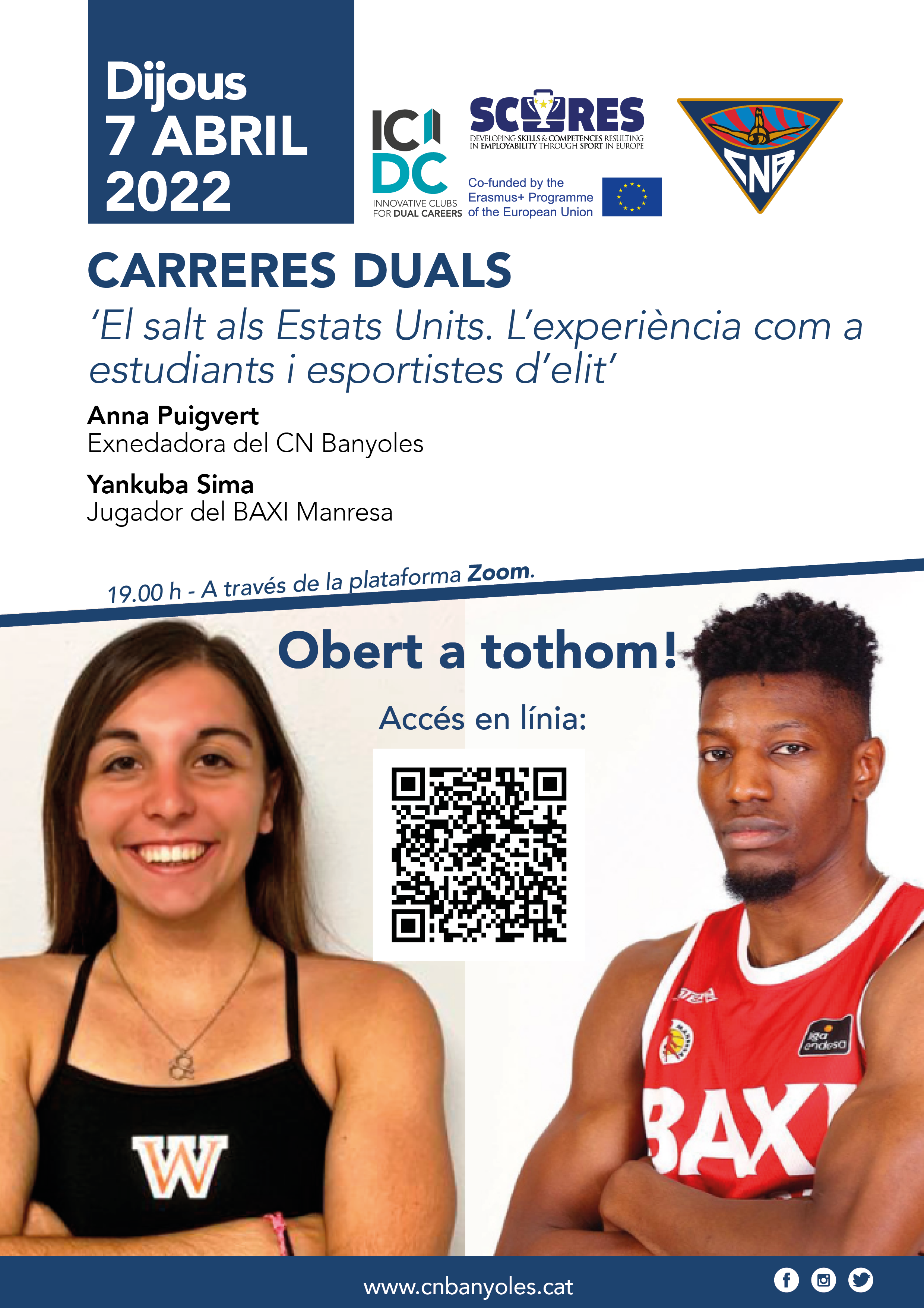 El proper 21 d’abril a les 19.00h tindrà lloc un nou seminari sobre carreres duals emmarcat al Projecte Europeu Scores. Porta com a títol: ‘El salt als Estats Units. L’experiència com a estudiants i esportistes d’elit’. Els protagonistes seran l’exnedadora del CN Banyoles, Anna Puigvert, i el jugador del BAXI Manresa Yankuba Sima.
