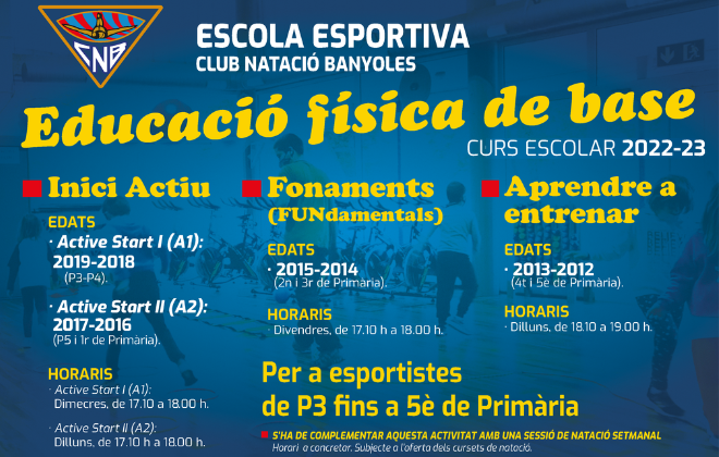 Avui s’ha publicat tota la informació referent a l’Escola Esportiva del curs 2022-23, que començarà a l’octubre. L’Escola Esportiva és una activitat pensada per a nens i nenes de P3 fins a cinquè de primària que permet combinar els cursets de natació que ja es porten a terme des de fa anys al Club amb sessions d’educació física de base.